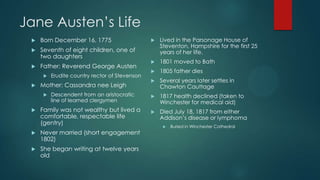Jane Austen was born in 1775 in Hampshire, England. She came from a family of clergymen and lived the first 25 years of her life in Steventon Parsonage. Though she never married, Austen began writing at a young age and published six novels during her lifetime, including Sense and Sensibility, Pride and Prejudice, and Emma. Austen drew inspiration from her family, personal experiences, and Regency-era English society in her works, which are known for their wit and social commentary. She lived a quiet life and died in Winchester in 1817 at the age of 41.