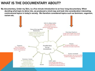 The document summarizes how the student's media project on body modification used and developed conventions of documentary films. Their 5-minute documentary focused on challenging stereotypes about body modification. They researched documentary modes and chose to use an expository approach with voiceover, interviews, facts and archival footage. They also produced a magazine article and radio trailer following conventions of those media. While they effectively utilized many conventions, they note ways their project could have been improved, such as clearer writing and lighting during interviews.