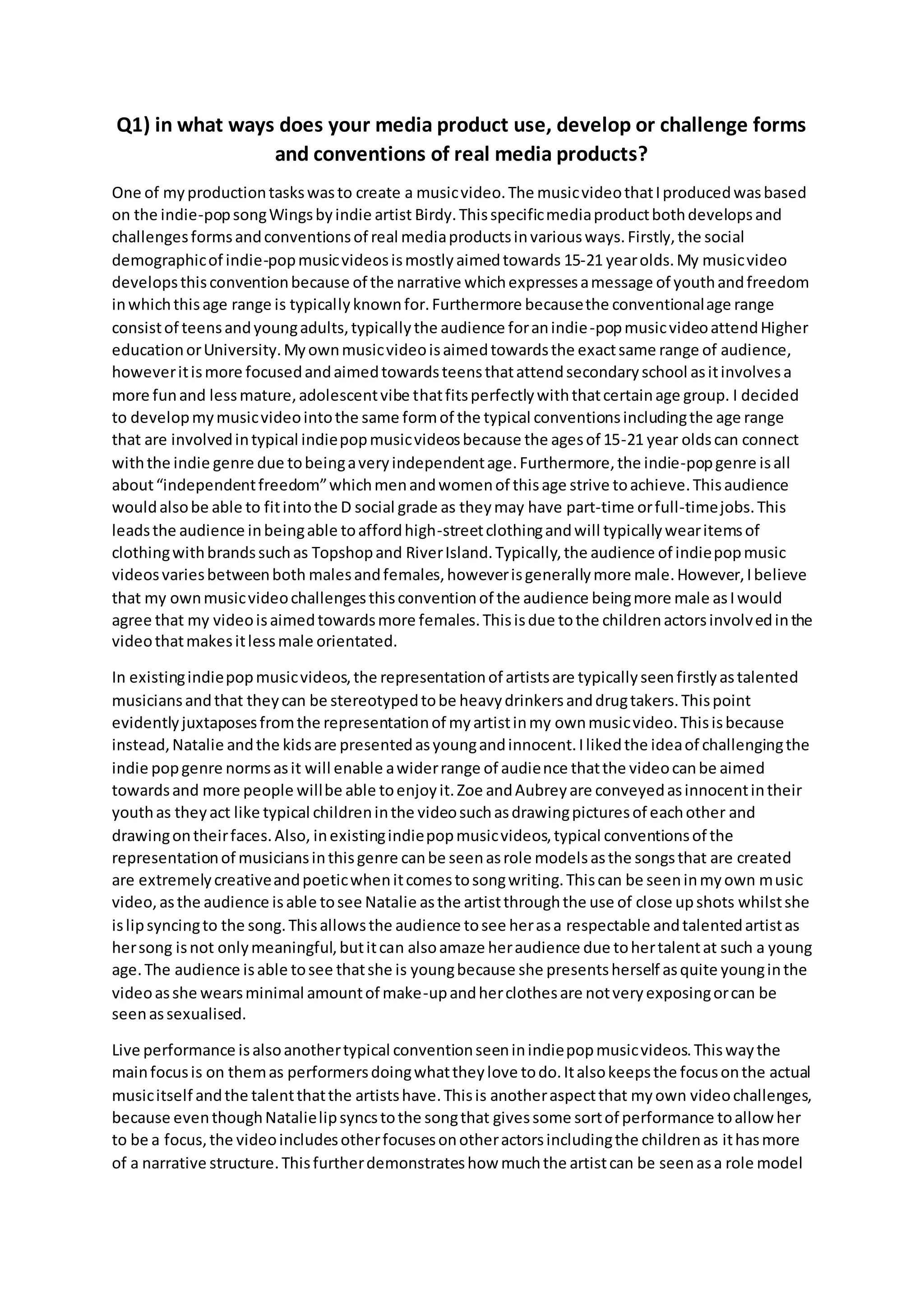 1) The music video challenges conventions of the indie pop genre in its audience demographic and representation of the artist. While typical videos target 15-21 year olds, this one focuses more on secondary school teens. It also challenges the typically male audience by including child actors.