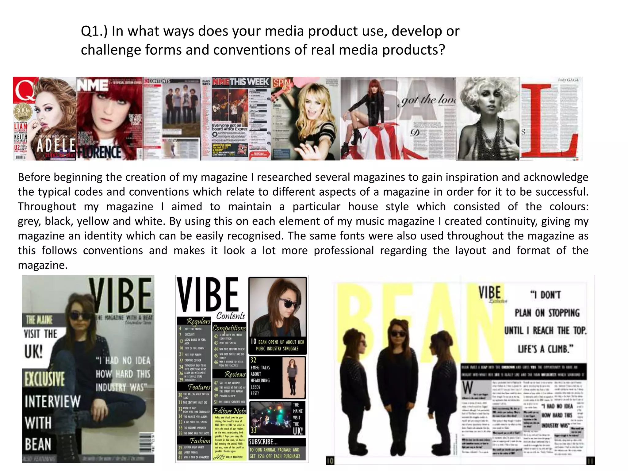 The document discusses how the media product both uses conventions of real music magazines as well as challenges some conventions. It follows conventions such as using consistent colors and fonts for continuity, including photos and captions, and blocking articles into categories on the contents page. However, it challenges conventions by placing the masthead on the right instead of left and using a long shot for the cover photo instead of a medium close-up. The document provides examples from researched magazines to support how it both conforms to and adapts real music magazine conventions for its target genre and ideas.