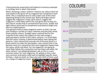 Throughout the document, the author discusses how their media product, a music magazine, uses and develops conventions from real music magazines like Kerrang and Rock Sound. The author chose conventional colors like black, red, white and yellow for the magazine's color scheme. Fonts, mastheads, barcodes, pull quotes, and other design elements were modeled after examples from existing magazines. While conforming to typical magazine conventions, the author also made some unconventional changes like removing a puff piece and adjusting colors and sizes. The goal was to create a realistic magazine that would appeal to readers while also developing the conventions in minor ways.