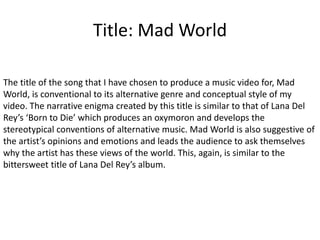 This document summarizes how the media product uses and develops conventions of real music videos. It discusses using a conceptual title ("Mad World") and setting (a park) to create narrative ambiguity, as seen in other music videos. Costuming the performer in skinny jeans and a leather jacket references the rock genre. Stop motion animation and dream-like transitions fragment the narrative, inspired by Gotye's "Somebody That I Used To Know." Encoding meanings allows for different interpretations, while post-production manipulations like animation, coloring, and fonts aim to establish conventions of the alternative rock genre seen in videos like McFly's "Transylvania" and Lana Del Rey's "Born to Die" album.