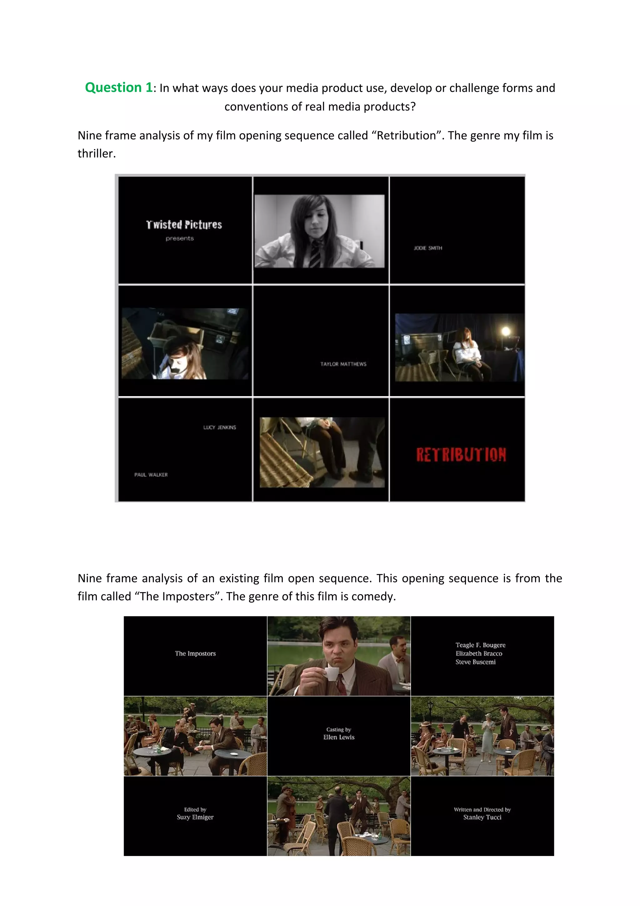 This document analyzes the opening sequences of two films - a thriller called "Retribution" and a comedy called "The Imposters" - through a nine-frame analysis. It finds that while some conventions are shared between the genres, such as displaying the film title, the thriller opening challenges conventions through unusual fonts, music, and credit positioning to build tension. In contrast, the comedy takes a more straightforward approach with centered credits and nature shots. Through shots of the victim, the thriller establishes a dark, confined setting and uses lighting and angles to convey vulnerability and power dynamics consistent with the genre.