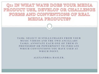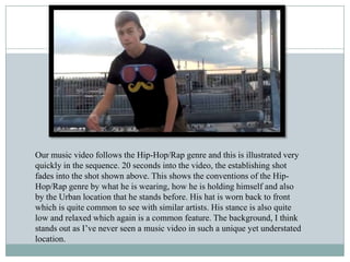 The document analyzes and annotates 10 stills/images from a music video for compliance with and deviations from conventions of the hip-hop/rap genre. Key conventions used include the artist's clothing, stance, and urban location in one shot, as well as dancing scenes. Some deviations are also noted, such as using the same locations throughout, more subtle displays of wealth, and shots that make the artist seem less dominant.