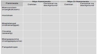 Tinalakay sa modyul na ito ang mga sinaunang paniniwala ng mga Pilipino gamit ang mga artefact at nakasulat na sanggunian, tulad ng bangang Manunggul. Ang artefact ay nagsisilbing primaryang sanggunian na naglalarawan ng kalagayan, kapaligiran, at kultura ng mga sinaunang lipunan. Bukod dito, sinuri rin ang iba pang paniniwala at ang pagbabago o patuloy na pagsasagawa ng mga ito sa kasalukuyan.