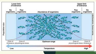 This document provides an overview of ecosystems and ecological concepts. It defines key terms like population, ecology, ecosystem, producers, consumers, decomposers, biotic and abiotic factors. It describes different types of natural ecosystems like forests, grasslands, deserts, tundra, taiga and aquatic ecosystems. It also discusses the relationships between living and non-living things within an ecosystem and the levels of organization. The document introduces concepts like the law of tolerance, zones of tolerance and intolerance, and limiting factors.
