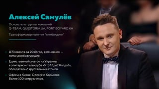 Алексей Самулёв является экспертом по командообразованию и основателем группы компаний с офисами в Украине, которая включает более 100 сотрудников. В документе обсуждаются методы улучшения вовлеченности сотрудников через различные опросы и подходы, такие как Gallup Q12 и eNPS, а также влияние вовлеченности на продуктивность и прибыльность бизнеса. Приводится аналитика о характеристиках вовлеченных и не вовлеченных сотрудников, а также практические рекомендации по улучшению рабочей среды и взаимодействия в команде.