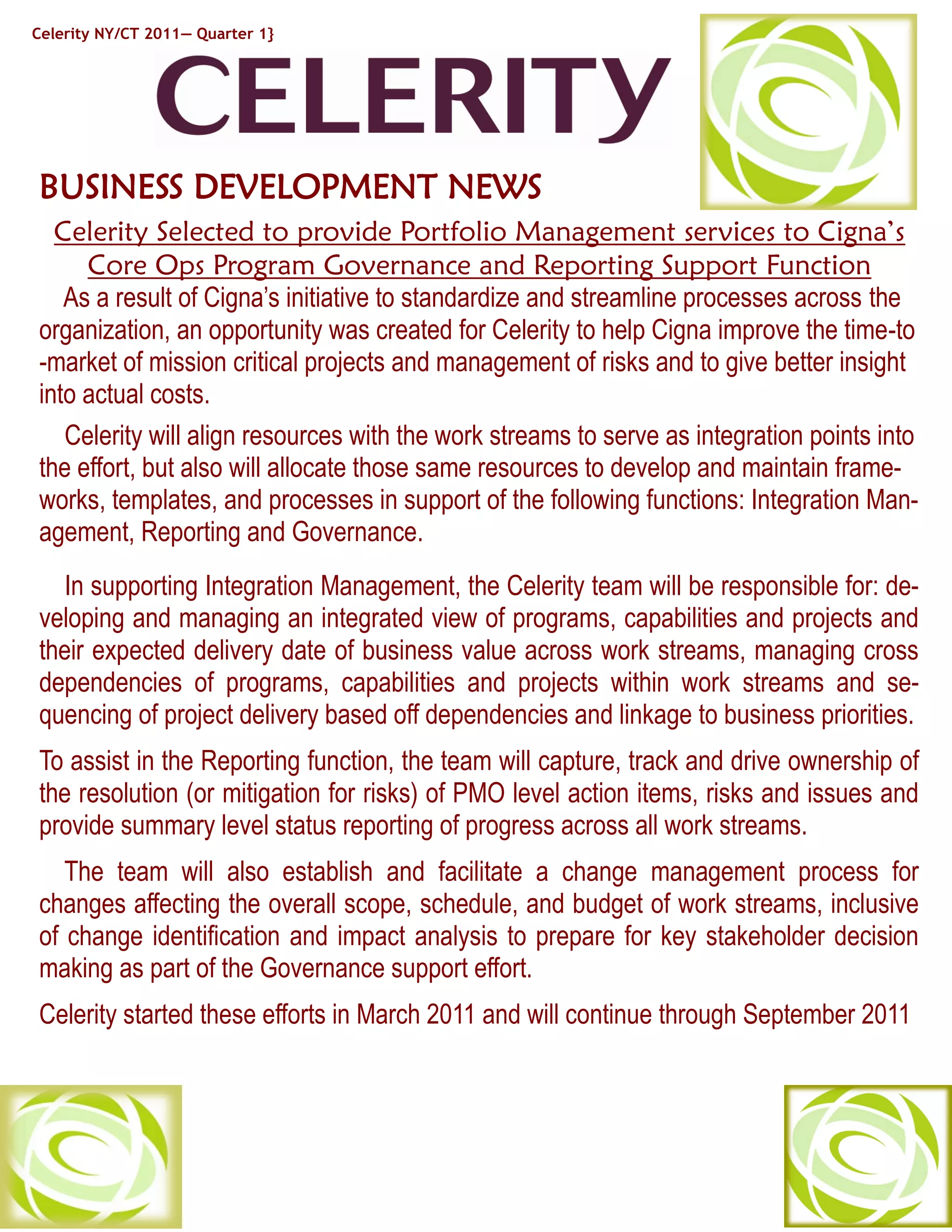Celerity was selected by Cigna to provide portfolio management services to help improve project timelines and provide better cost insights. Celerity will help with integration management, reporting, and governance for Cigna. This will include developing integrated project views, tracking action items and issues, and facilitating change management. Celerity began working with Cigna in March 2011 and will continue through September 2011.