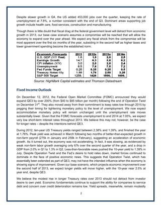 The document discusses the economic outlook for the US as of the first quarter of 2013, highlighting ongoing fiscal policy debates and uncertainties that impact market conditions. While there were positive job additions and a potential compromise on budget cuts, concerns about slow GDP growth and possible sequestration lingered. The Federal Open Market Committee's monetary policy is expected to remain accommodative, but rising interest rates and potential changes in municipal bond tax status provide caution for investors.
