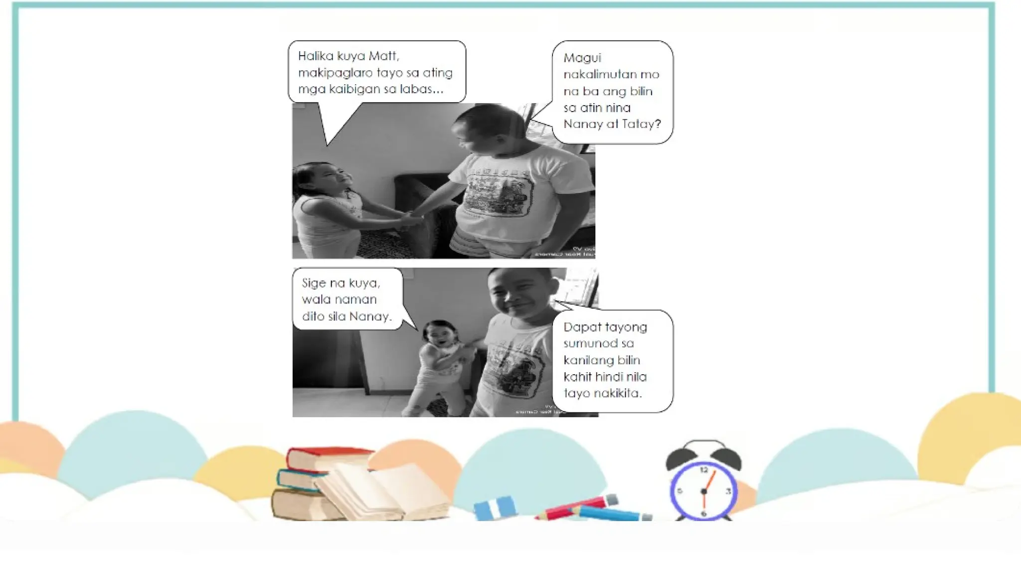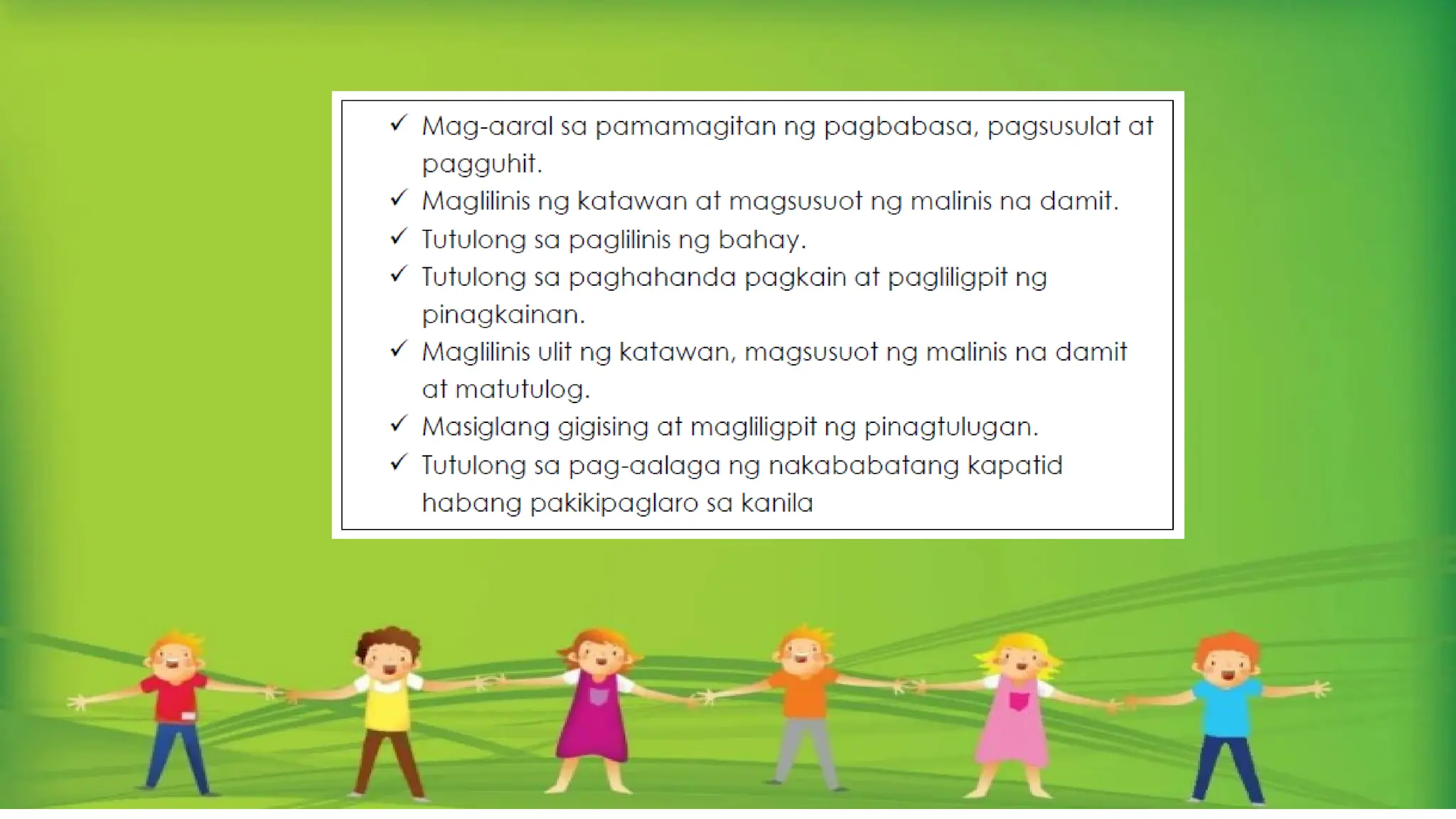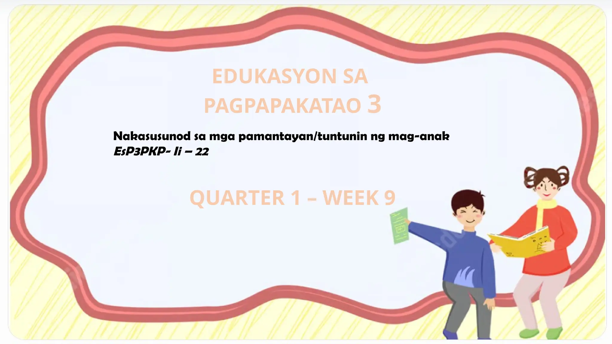 Ang dokumento ay tungkol sa edukasyon sa pagpapakatao, na naglalaman ng mga pamantayan at tungkulin ng mag-anak na dapat sundin ng mga mag-aaral. Isinasalaysay ang kwento ni Maggie, isang batang nag-aaral na tumutulong sa kanyang pamilya kahit sa panahon ng pandemya. Ang mga aktibidad at aralin ay nakatuon sa pagpapahalaga sa oras at mga responsibilidad sa loob ng tahanan.