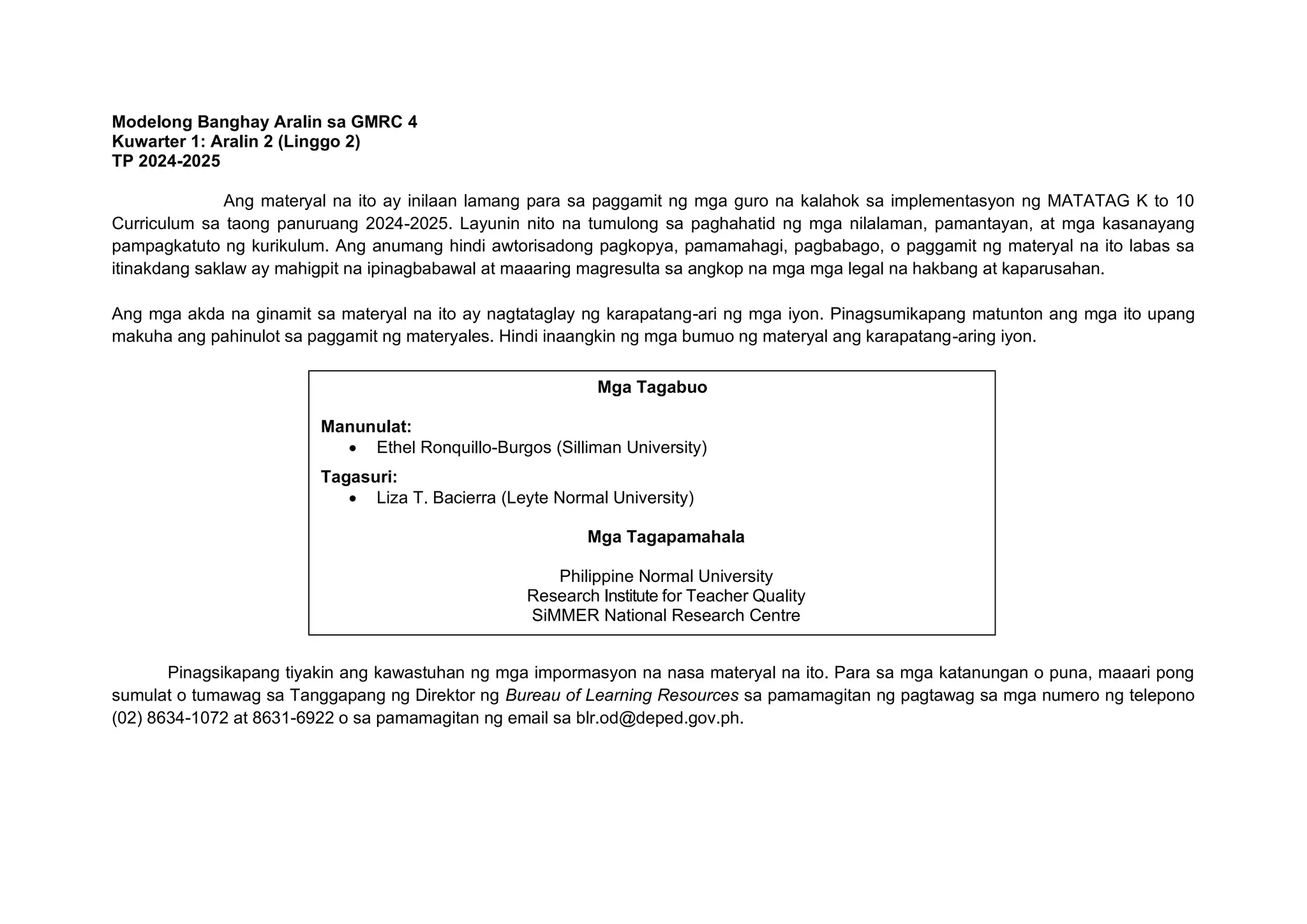 Ang dokumento ay isang materyal na itinakda para sa mga guro na kasali sa implementasyon ng Matatag K to 10 Curriculum para sa taunang 2024-2025, na naglalayong magbigay ng mga nilalaman at kasanayan sa pagkakaroon ng mabuting pakikitungo sa mga kasapi ng pamilya. Kasama sa mga layunin ng aralin ang pag-unawa at pagsasanay ng mga mag-aaral sa mga gawi ng mabuting pakikitungo, pagtuturo ng pagtanggap at pag-unawa sa mga emosyonal na aspeto ng pakikitungo. Ang dokumento ay naglalaman din ng mga hakbang sa pagtuturo at mga batayang sanggunian na maaaring gamitin sa proseso ng pagkatuto.