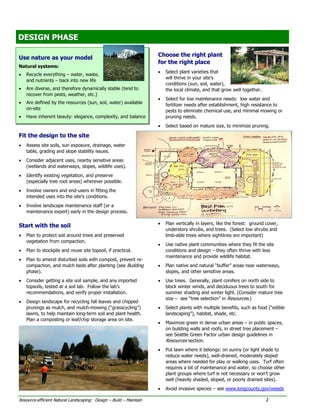 This document provides guidance on designing, building, and maintaining natural landscapes. It discusses choosing plants suited to site conditions, amending soils with compost, mulching, limiting turf areas, designing efficient irrigation, and using integrated pest management. The goal is to create landscapes that require less water, fertilizer, and pesticides while providing wildlife habitat and other benefits.