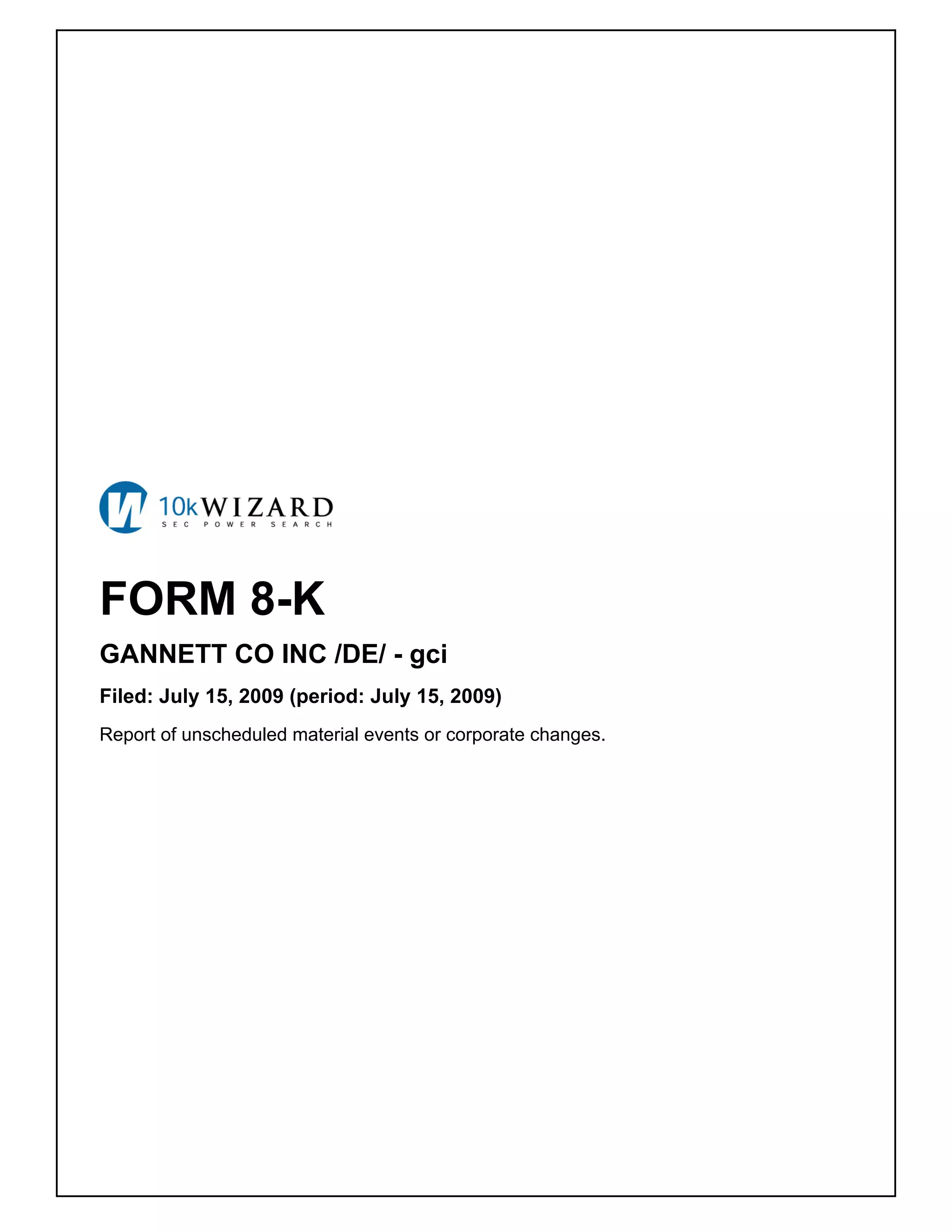 Gannett reported Q2 2009 earnings per share of $0.30 compared to a loss per share of $10.03 in Q2 2008. Excluding special items, EPS was $0.46 in Q2 2009 compared to $1.04 in the prior year. Total revenues declined to $1.4B from $1.7B due to weak advertising demand. Operating expenses declined 67% due to large impairment charges in 2008. The company generated $252M in operating cash flow for the quarter and ended with $3.5B in debt.