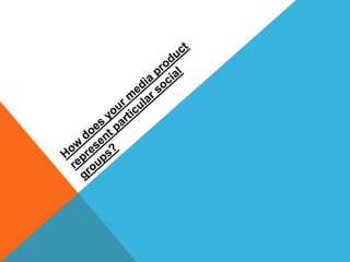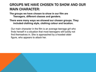 The document discusses a film project focusing on teenagers. It will feature a main character who is an average teenage girl who finds herself attacked alone in a remote location. To represent teenagers, the film will show different styles of clothing, colors, and locations. The main character wears black leggings, a long white shirt, and brown/white coat, reflecting typical teenage girl fashion. Her plain white shirt and isolated setting convey innocence and vulnerability. The film also aims to subvert gender stereotypes by initially showing the male as powerful but ending with the female overpowering him. It will portray social classes through the attacker's plain clothes versus the protagonist's wealthier outfit. While reinforcing stereotypes of teenage girl insecurity, the