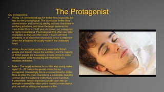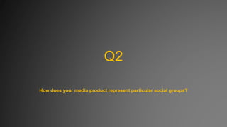 The document discusses the representation of social groups in the media product. The protagonist is described as a young, white, middle-class, intelligent, physically and mentally able male. This makes the character relatable to the target audience of 15-25 year old males. The antagonist is also described as a young, white, intelligent, middle/upper class male whose genius plan to manipulate the protagonist shows he prioritizes success over honor. Both characters use their intelligence rather than physical strength. The protagonist is shown expressing emotions in a way typically seen as feminine.