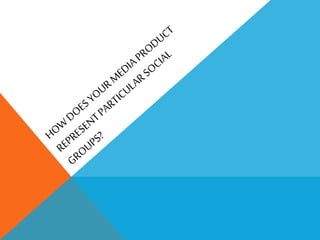 The document summarizes how social groups are represented and the technical structures used in a film production. The cast consists of a male detective and female criminal protagonist. Stereotypes are not represented and the production subverts conventions by portraying the female in a more positive light who outwits the male. Technically, the female wears formal red and black attire linked to film noir conventions. She remains calm and in control of the conversation through dialogue, while lighting and camera work create mystery and do not give precedence to either character.