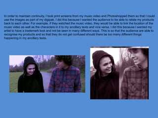 The student created a music video and ancillary texts about body image issues faced by young girls. The music video tells the story of a vulnerable girl named Mirneva who feels fat and ugly and goes running excessively. The ancillary texts show Mirneva as a strong woman to reassure girls that their self-image will improve. Continuity was maintained between products by using the same images from the music video shoot. Editing techniques like lowered brightness and a blue tint were used in the music video to emphasize Mirneva's sadness, and brightness increased when a boy appeared to show her mood lifting. The student believes their products effectively address important issues for their target audience.