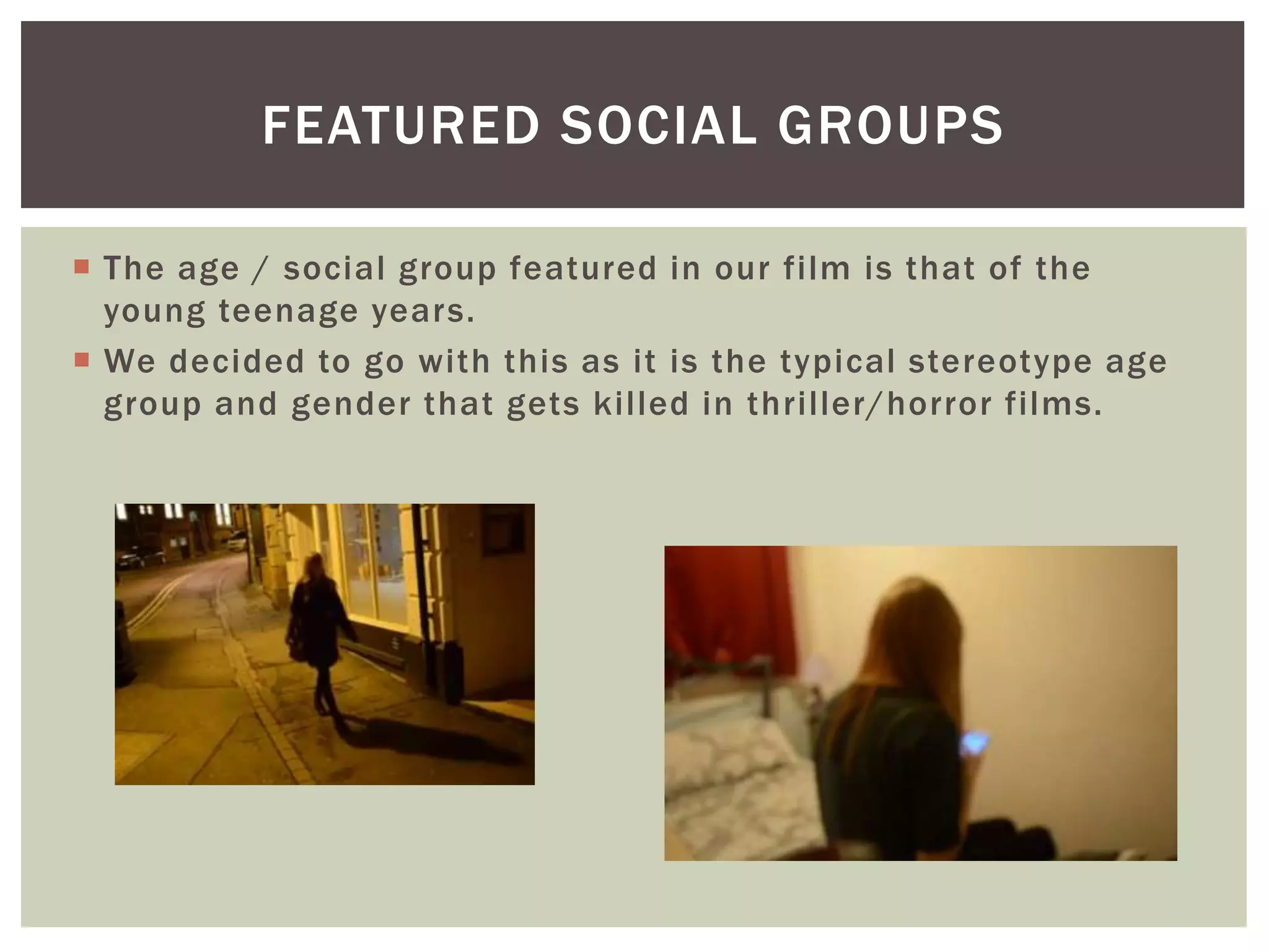 The document discusses how a short film represents teenagers, particularly young white females. It focuses on portraying the main character, a teenage girl, through typical stereotypes of her age, gender, and ethnicity. Specifically, it depicts her with a mobile phone, school bag, and in a teenage bedroom filled with stereotypical items. However, her dark clothing is meant to foreshadow her impending death, reinforcing the common horror trope of killing off female characters. Overall, the film aims to realistically portray contemporary teenage life while also playing on genre conventions.
