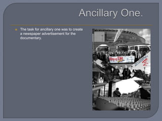 The document describes the process of creating a documentary about Hope FM radio station. It discusses creating a newspaper advertisement and radio trailer for the documentary. It describes editing techniques used like keeping a recurring motif throughout, adding narrative devices to introduce interviewees, and ensuring plenty of intercuts to keep the audience interested. The summary focuses on the key details around creating promotional materials and editing the documentary.