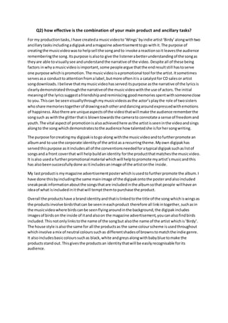 The combination of the main music video product and two ancillary tasks of a digipak and magazine advertisement are effective at promoting the artist and song. The music video conveys the narrative of the song lyrics visually through the story of two sisters sharing memories. Both the digipak and magazine advertisement feature the same imagery of birds to maintain branding consistency across products and link them to the title of the song, "Wings". A neutral color palette is used throughout the products to match the indie music genre.