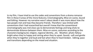The document summarizes the filmmaker's use of codes and conventions from drama/romance films in their own film. They drew from films like One Day and The Fault in Our Stars in areas like cinematography (close-ups to show emotion, long shots for distance), mise-en-scene (costumes to reflect characters, lighting for mood), sound (voiceover, soundtrack, dialogue) and editing (transitions, slow motion, pace). While their narrative was different, focusing on friendship rather than death, they tried to implement conventional techniques to effectively convey emotion and connect with the audience.