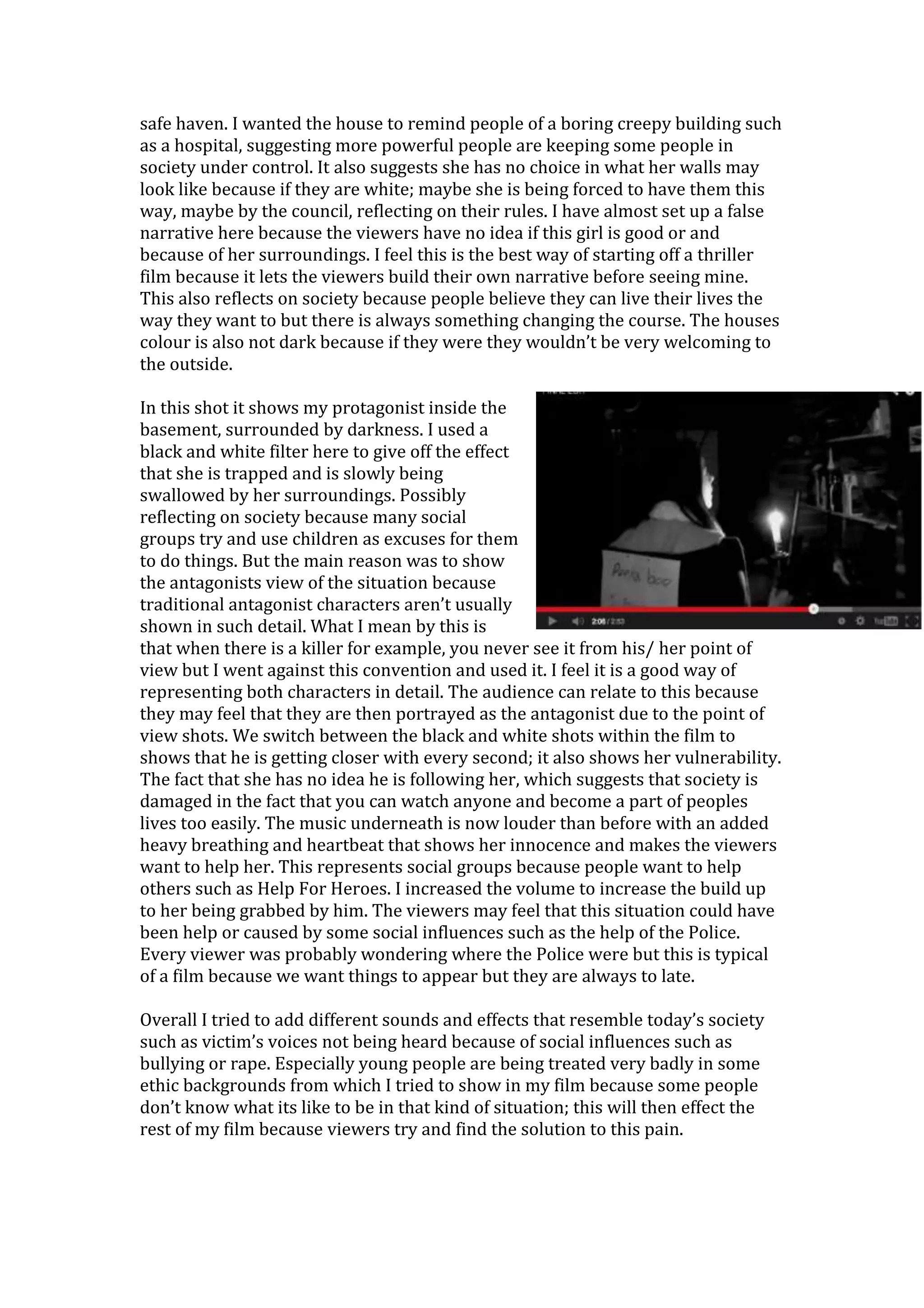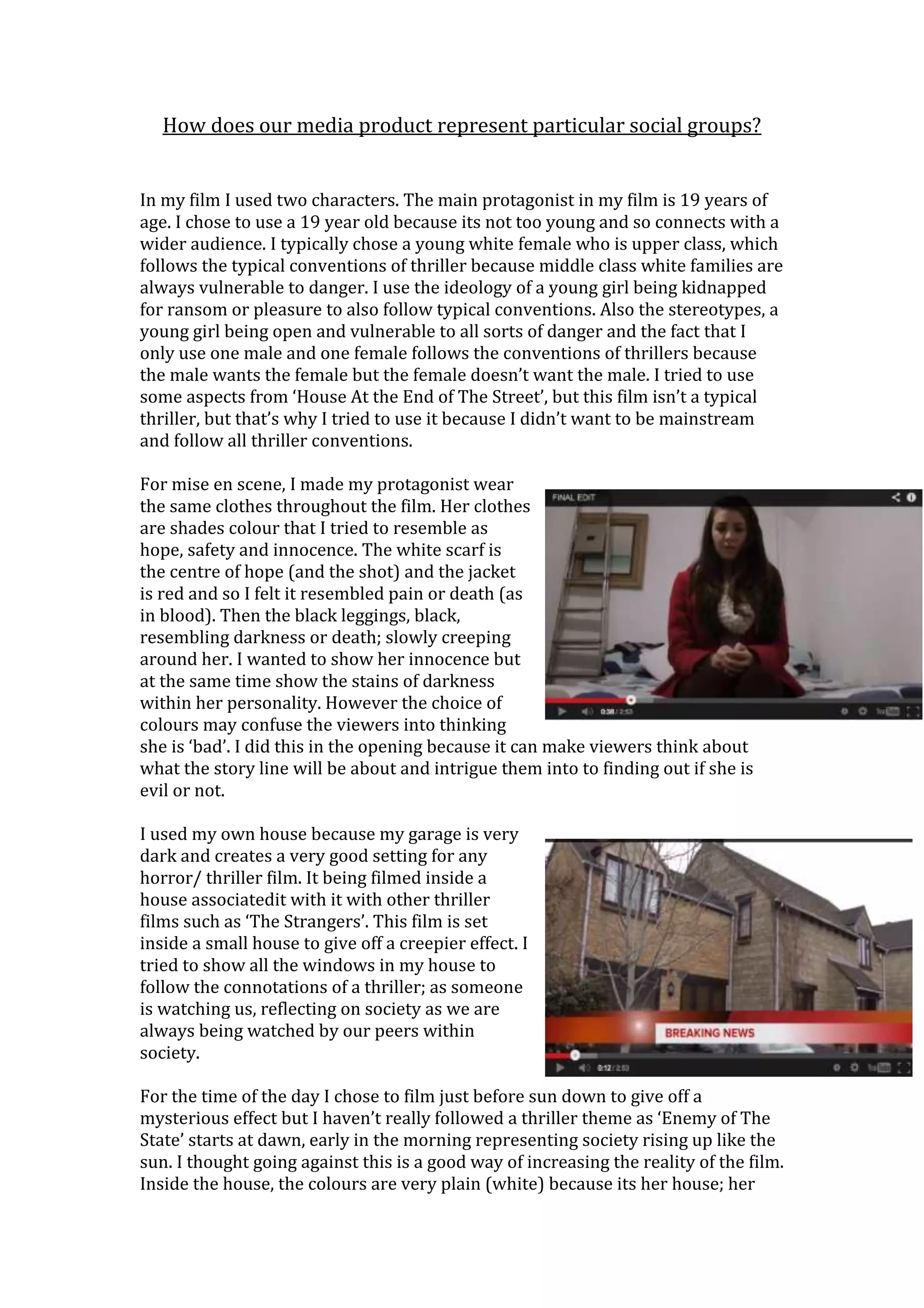 The document discusses the filmmaker's choices in creating their thriller film. They chose to use a 19-year-old white female protagonist to appeal to a wide audience and follow thriller conventions. Locations like a dark garage and plain white house were used to create a creepy atmosphere and reflect the idea of people being controlled in society. Shots from the antagonist's point of view and a black and white filter in the basement were intended to make viewers relate to both characters and show the protagonist's vulnerability. Through these creative decisions, the filmmaker aimed to represent and comment on various social groups and influences in society.