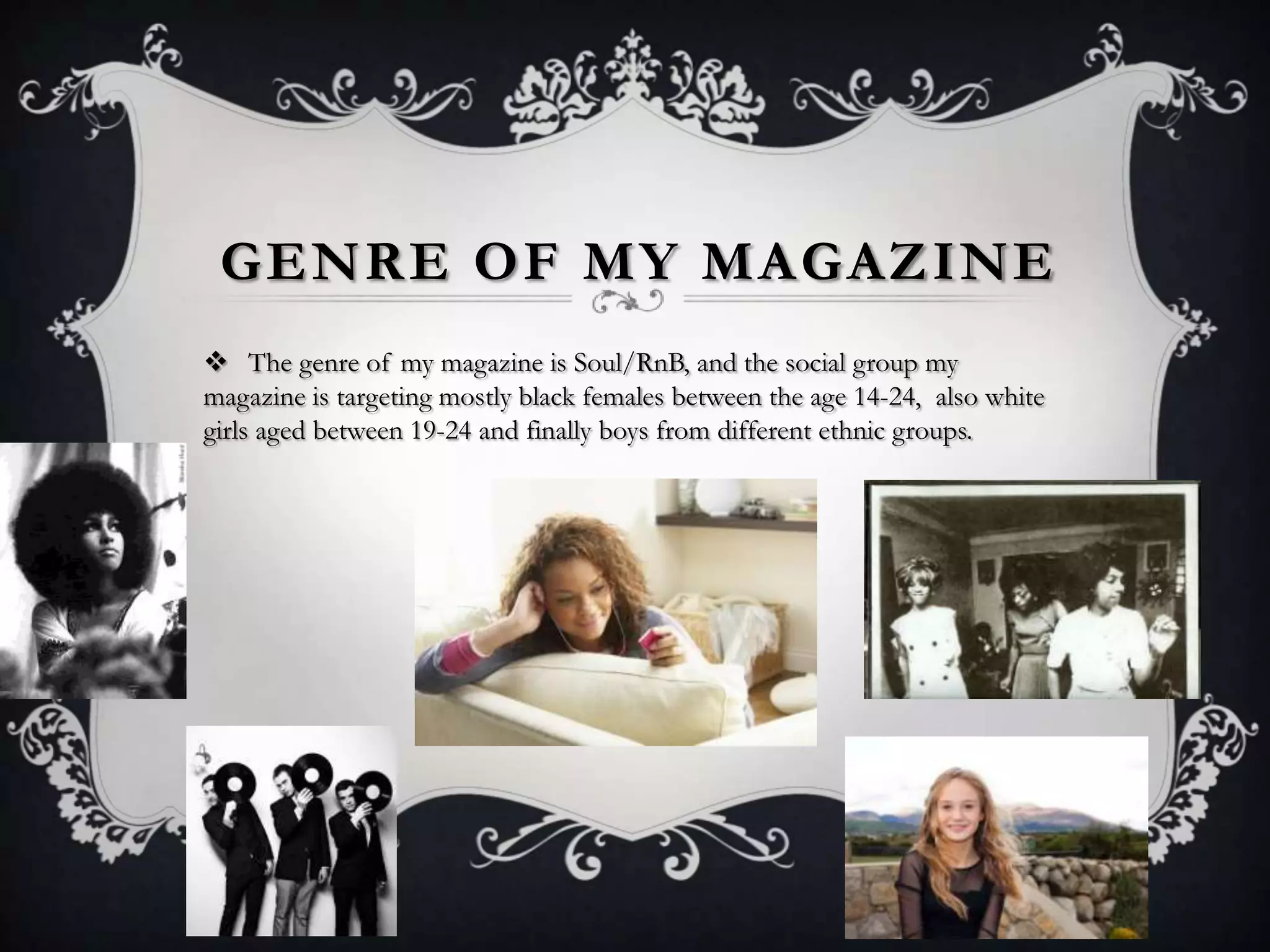 The magazine targets black females aged 14-24, white females 19-24, and boys of various ethnicities. The black female model represents the primary target group. Her strong, fearless pose shows black women as role models. The simple yet vibrant clothing and colorful red lipstick allow the target audience to relate to the model's style. A microphone prop conveys themes of R&B/soul music and individualism. Both formal and informal language mimics other magazines in the genre. Colors of red, white, black and brown are unisex and evoke concepts like love and life that appeal to the target demographic.