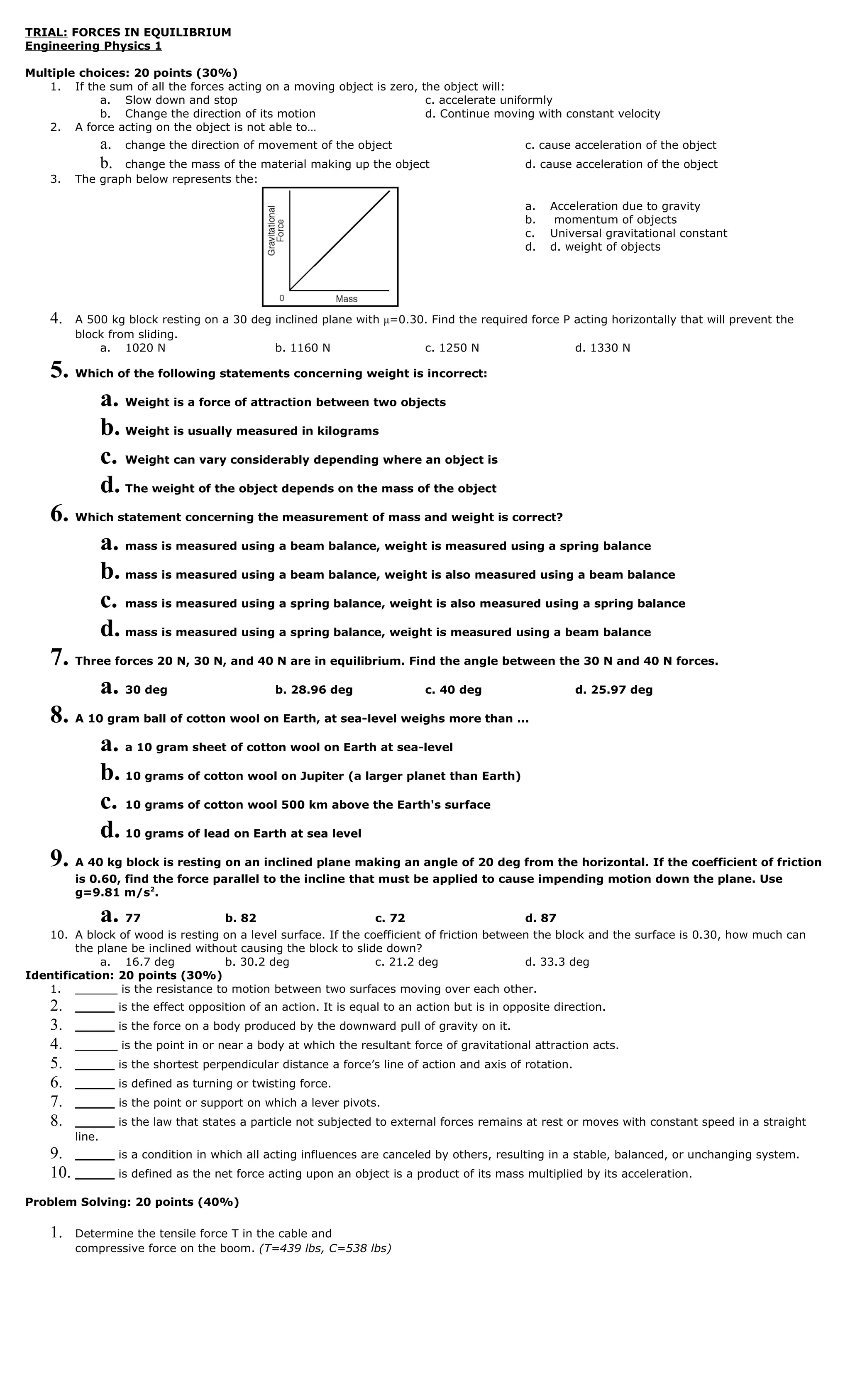 1. The document contains a multiple choice quiz with questions about forces, equilibrium, friction, mass, weight, and other physics concepts.