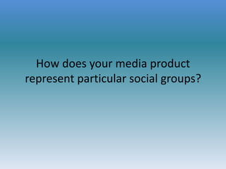 The document discusses how the media product represents social groups. It targets 16-25 year olds of both genders by including a variety of artists and article topics. The main social group that would be interested in the magazine is rock and indie musicians. The magazine represents these musicians positively by highlighting their successes. However, it mainly conforms to stereotypes about rock artists through the magazine's style, imagery, and content choices.