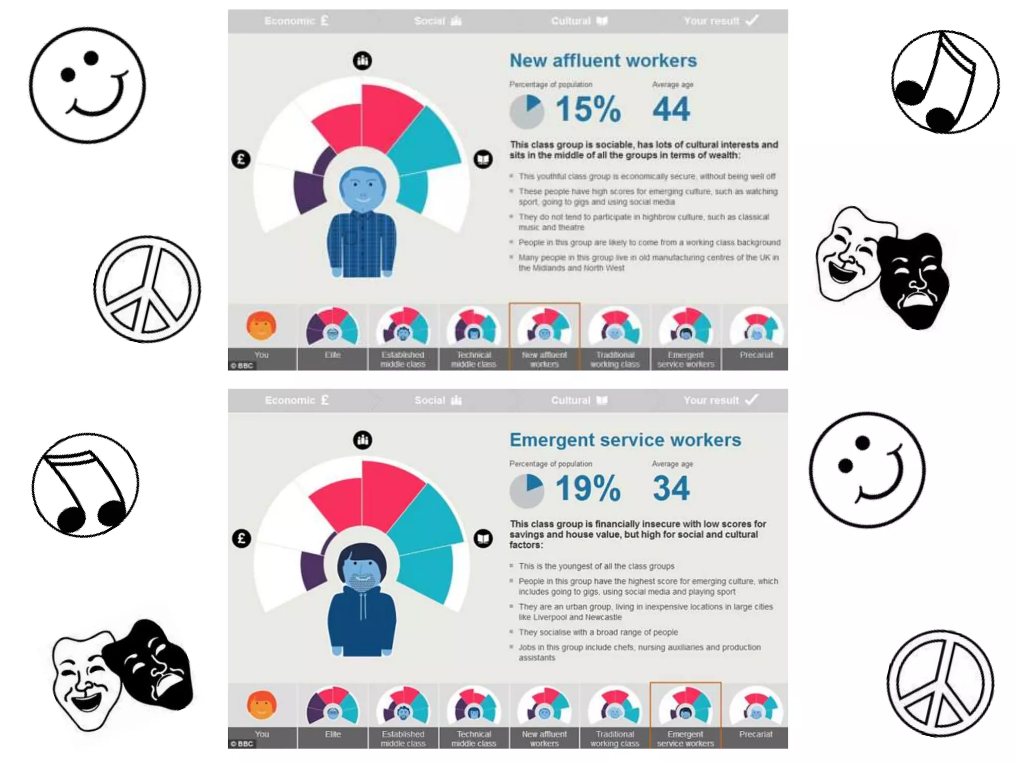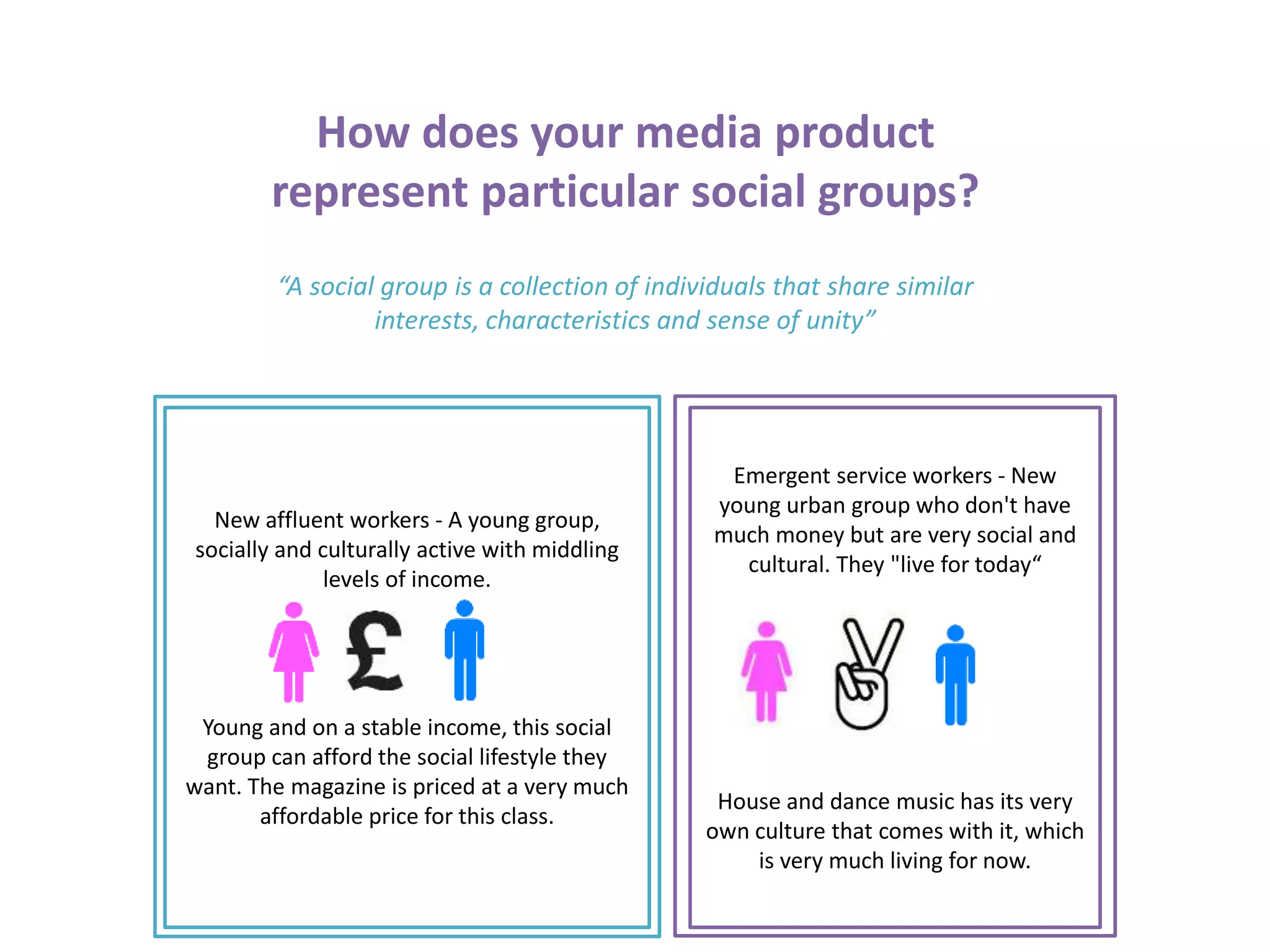 This document summarizes how a media product represents two particular social groups: New Affluent Workers and Emergent Service Workers. It does this through the magazine's price point being affordable for New Affluent Workers, images of vibrant young models and people in the magazine relating to the lifestyle of the social groups, article topics focusing on music genres and places like Ibiza that attract these social groups, and an informal tone of address that suits young readers.