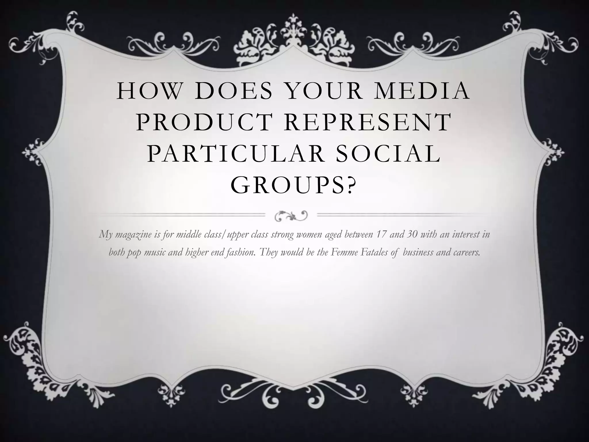 The magazine represents middle to upper class women aged 17-30 interested in pop music and high fashion. The female editor leads a successful career, representing the audience. Images of women use stereotypes of sex objects but to assert dominance, wearing short black dresses with red lipstick. Colors of black and red connote empowerment and dominance, representing the audience of career women who care about appearance and fashion. Font choices include serif and sans serif to appear both classic and modern, representing the audience who seek a balance of class and modern style.