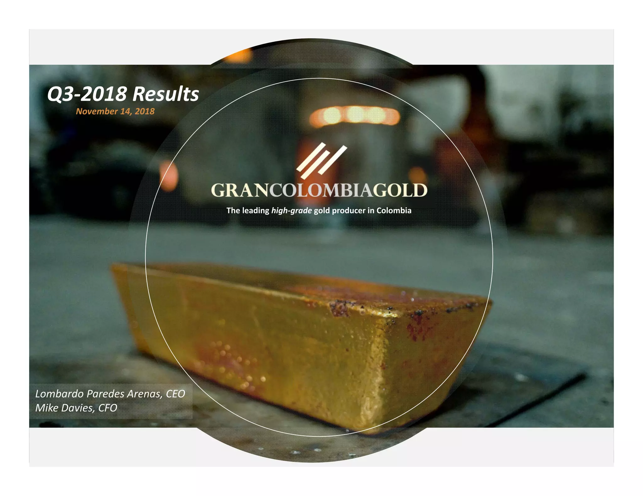 Gran Colombia Gold reported financial and operating results for the third quarter of 2018. Gold production increased to 57,163 ounces, up 54% compared to the third quarter of 2017. Revenue for the quarter was $66.6 million, an increase of 56% year-over-year. Cash costs per ounce averaged $657 for the quarter, a decrease from $748 in Q3 2017. For the first nine months of 2018, gold production totaled 162,741 ounces with revenue of $200.3 million and cash costs averaging $674 per ounce. Gran Colombia is on track to meet its 2018 annual production guidance of between 214,000 to 220,000 ounces of gold.