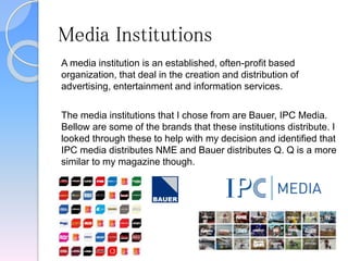 Bauer would be the best media institution to distribute the author's music magazine product. Bauer distributes Q magazine, which focuses on mainstream artists like Beyoncé and Lady Gaga, similar to the author's concept. Bauer is also Europe's largest publishing group, distributing over 600 magazines to over 22 million customers per week, providing a large established customer base and reputation that would benefit a new magazine's success.