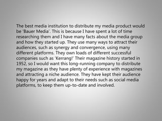 The author argues that Bauer Media would be the best institution to distribute their media product. Bauer Media uses various platforms like magazines, radio, social media, and Spotify to attract over 22 million weekly UK users. They adapt to their audience's preferences across different platforms. Distributing through Bauer Media would allow the author's audience to engage through multiple channels and expand the audience. Bauer Media is also experienced in magazine publishing and keeping audiences interested by featuring new artists, which would benefit the author's magazine focused on a new artist.
