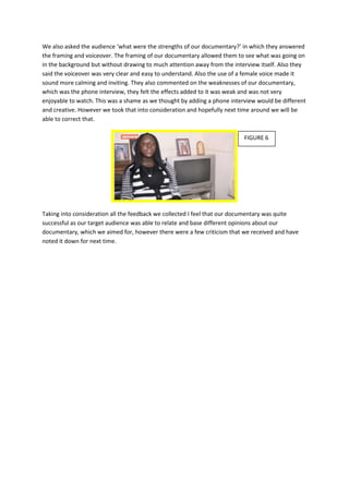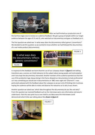 The document discusses feedback received from the target audience of a documentary produced by the author. The feedback focused on how well the documentary followed conventions of the genre, with positive feedback on the use of cutaways and editing transitions. Audience members also felt the inclusion of the production logo made the documentary seem professional. However, feedback indicated that phone interviews included in the documentary were weak and not enjoyable to watch. Overall, the author felt the documentary was successful in engaging the target audience, while also learning areas for improvement in future productions.