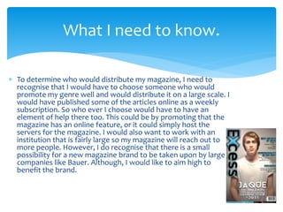 The document discusses potential media institutions to distribute a new magazine. It considers Prometheus Global Media first due to their distribution of Billboard magazine, which focuses on hip-hop/pop like the new magazine. However, reviews found issues with Prometheus' management. The document then explores Bauer Media as another option, as they distribute a wide range of genres, though few hip-hop brands. Bauer receives better overall reviews than Prometheus.