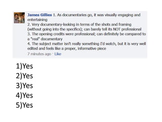 The document summarizes feedback received from audiences on a documentary and print advertisement. It discusses responses to questions about whether the documentary was entertaining, had good quality, was eye-catching, seemed professional, and whether people would watch it on TV. The feedback was overwhelmingly positive, with some suggestions for improvements. It also summarizes feedback on questions about whether the print ad was eye-catching, matched the theme, would influence viewing, and what looked most professional. Again, the feedback was mostly positive with minor suggested changes.