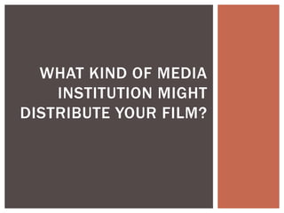 This document discusses what type of media institution might distribute an independent film. It argues that while the film has a low budget and no famous actors, independent films can still find global audiences and success. It provides examples of the independent films The Revenant and Seven, which both gained popularity among viewers and high reviews on IMDB despite being independent productions. These films served as inspirations for the thriller elements and costumes used in the filmmaker's own independent production.