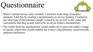 The respondent conducted a questionnaire through Survey Monkey to understand audience preferences for documentary genres and conventions. Gender was the first question to avoid bias, and genres were ranked from most to least preferred. Archive footage and interviews were most popular requested elements. The respondent also used Yougov to analyze genre consumption by demographics like age, gender and location. Different research methods were used like questionnaires, interviews, and focus groups, each with advantages and disadvantages. Peer and family feedback on draft tasks and the documentary itself helped improve the products by highlighting needed changes to suit the audience.