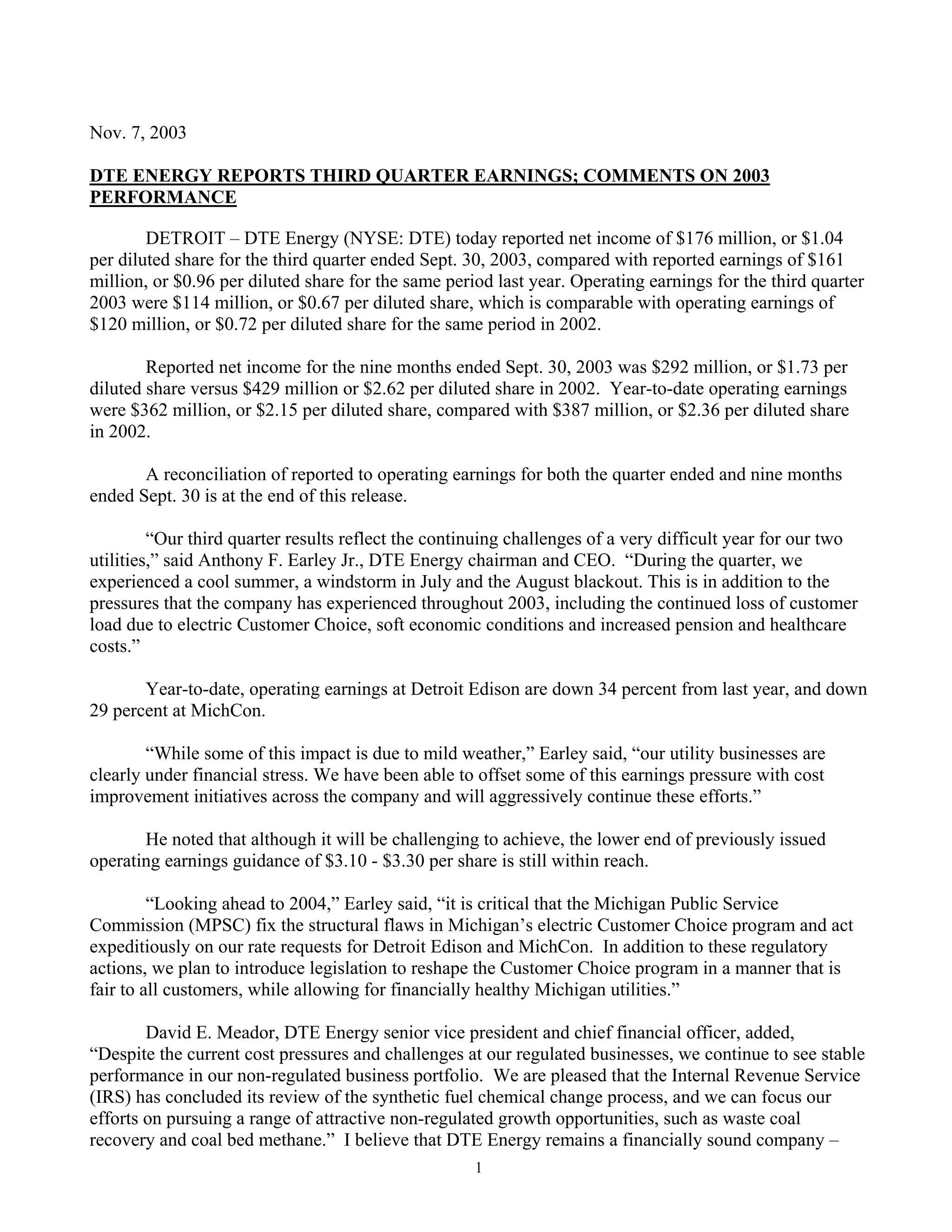 DTE Energy reported third quarter net income of $176 million compared to $161 million in the previous year. Operating earnings for the third quarter were $114 million, comparable to the $120 million in 2002. For the first nine months, net income was $292 million compared to $429 million in 2002, while operating earnings were $362 million versus $387 million the prior year. The company faced challenges from a cool summer, storms, and the August 2003 blackout. Looking ahead, the company said regulatory actions and legislative changes are needed to address issues with Michigan's electric customer choice program.