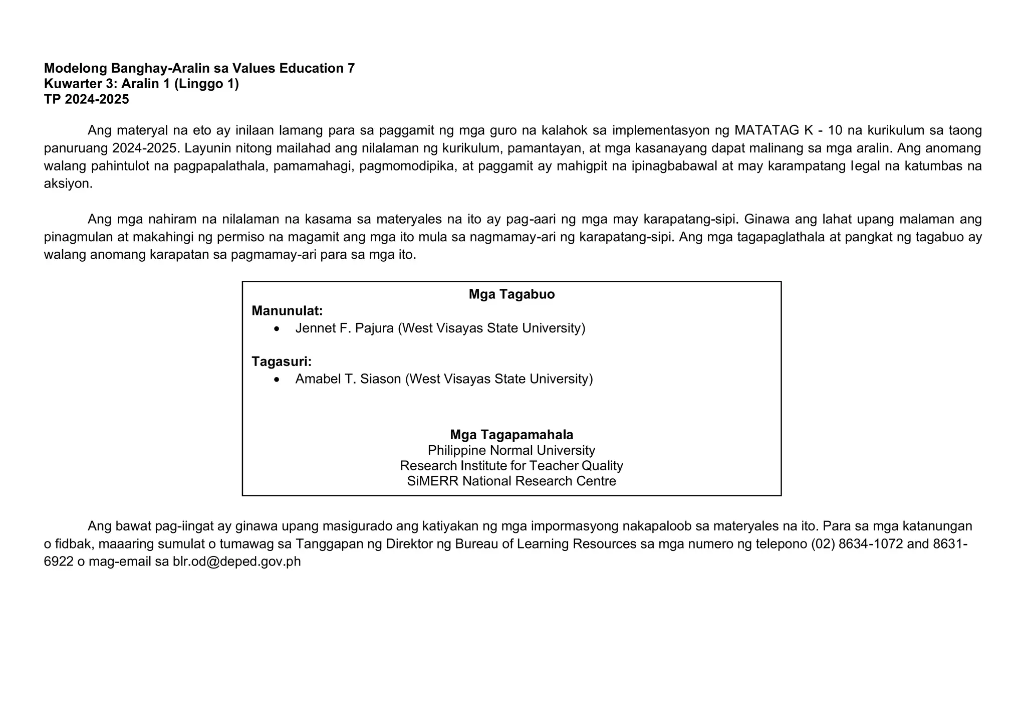 Ang dokumento ay isang modelong banghay-aralin para sa mga guro sa Values Education 7 para sa taong panuruang 2024-2025, na naglalayong tukuyin at paunlarin ang mga talento at hilig ng mga mag-aaral. Naglalaman ito ng mga layunin, pamantayan at mga hakbang sa pagtuturo na nagbibigay-diin sa kahalagahan ng tiwala sa sarili at ang pagkilala sa mga natatanging kakayahan. Ang materyal na ito ay mahigpit na nakalaan para sa mga guro at may mga legal na limitasyon sa paggamit at pamamahagi nito.