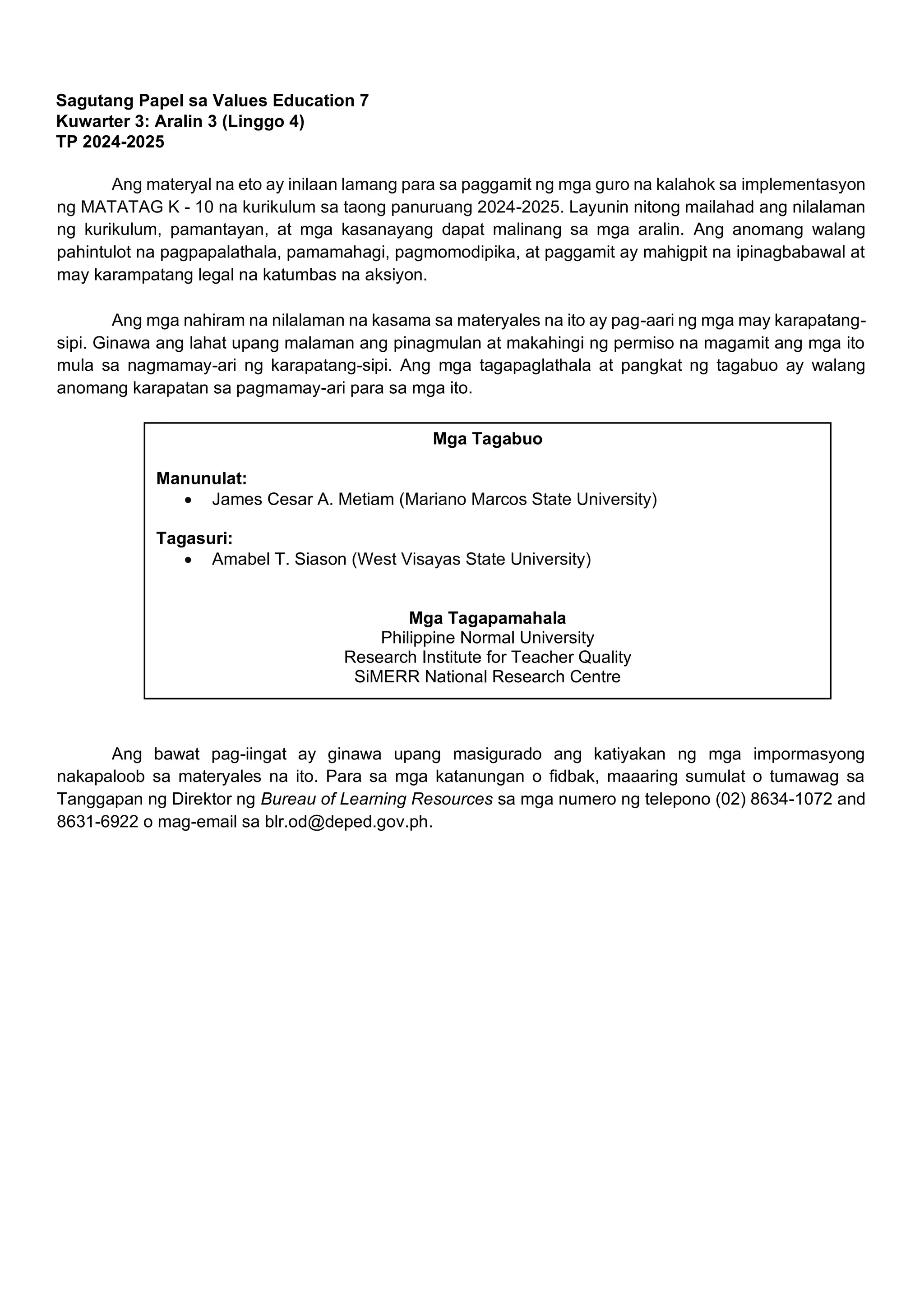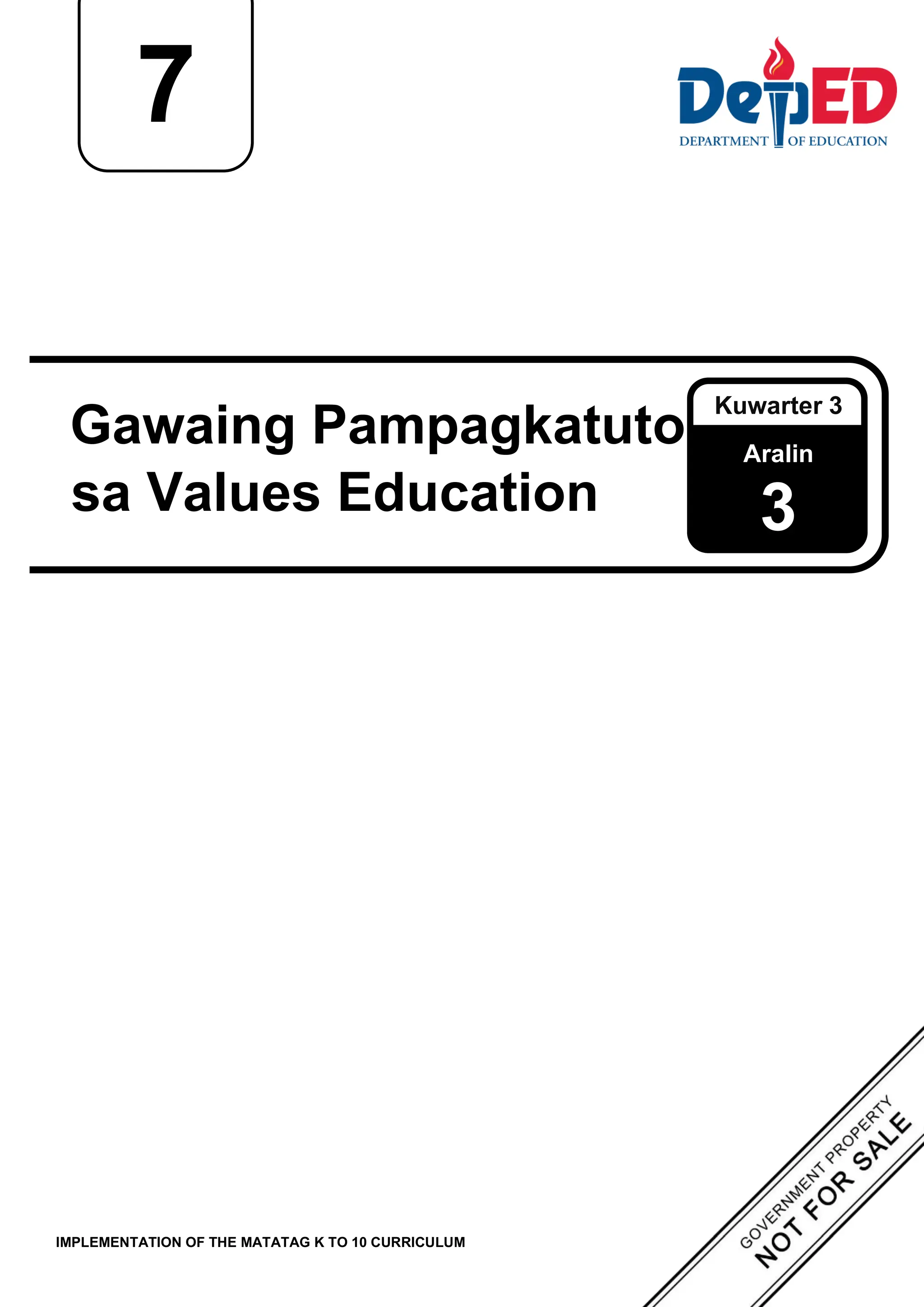 Ang dokumento ay naglalaman ng mga gawain at layunin para sa Values Education 7, Kuwarter 3, Aralin 3 na nakatuon sa pakikipagkaibigan. Layunin nitong linangin ang mga kasanayan at pamantayan sa pakikipagkaibigan sa mga mag-aaral sa pamamagitan ng iba't ibang aktibidad tulad ng liham at collage. Nakasaad din ang mga materyales at hakbang na dapat sundin ng mga guro sa implementasyon ng Matatag K to 10 Curriculum para sa taon ng 2024-2025.