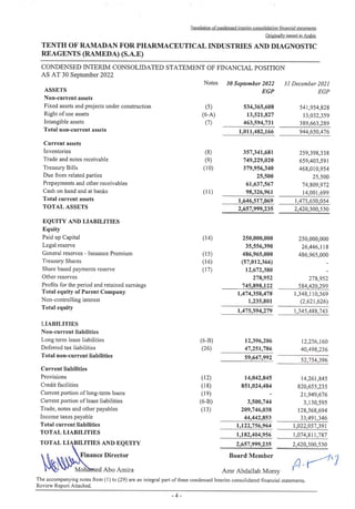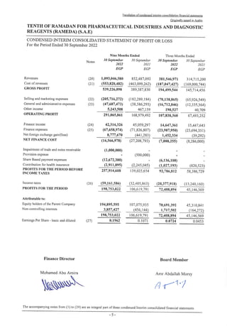 This document is the condensed interim consolidated financial statements for Tenth of Ramadan for Pharmaceutical Industries and Diagnostic Reagents (Rameda) (S.A.E) for the period ended 30 September 2022. It includes a review report from an independent auditor, condensed statements of financial position, profit or loss, comprehensive income, changes in equity, cash flows, and notes to the financial statements. The review report indicates the financial statements were prepared in accordance with Egyptian Accounting Standards and that nothing came to the auditors' attention that would cause them to believe the financial statements do not present fairly the financial position and performance of the entity.