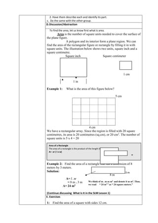 This document contains a three-day lesson plan for a Grade 6 mathematics class on finding the area of composite figures. Day 1 introduces finding the area of solid figures and has students make examples. Day 2 covers finding the area of composite figures by separating them into simpler shapes and adding the areas. Examples of composite figures are shown. Day 3 reviews solving word problems using the basic steps and has students practice finding the area of composite figures in exercises and word problems. The goal is for students to be able to solve routine and non-routine area problems involving composite figures.