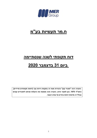 רבעונים והפסד רווח דו"חות תמצית :כספיים דו"חות ראשון רבעון שני רבעון רבעון שלישי רביעי רבעון סה"כ 2020 ממכירות הכנסות 108,933 90,778 84,502 91,041 375,254 המכירות עלות 94,037 79,500 74,234 82,352 330,123 ג רווח ו למי 14,896 11,278 10,268 8,689 45,131 נטו ,ופיתוח מחקר הוצאות 2,530 2,068 1,919 2,225 8,742 ושווק מכירה הוצאות 4,974 3,429 3,396 2,792 14,591 וכלליות הנהלה הוצאות 8,430 7,671 6,691 7,442 30,234 הוצאות ( הכנסות ) אחרות ( 4,429 ) ( 406 ) 1,055 477 ( 3,303 ) הפסד רגילות מפעולות 3,391 ( 1,484 ) ( 2,793 ) ( 4,247 ) ( 5,133 ) מימון הכנסות 4,345 2,882 1,024 548 8,799 מימון הוצאות ( 6,388 ) ( 6,311 ) ( 7,409 ) ( 7,962 ) ( 28,070 ) ב החברה חלק רווחי ,כלולות חברות נטו 161 310 376 488 1,335 רווח מסים לפני )(הפסד 1,509 ( 4,603 ) ( 8,802 ) ( 11,173 ) ( 23,069 ) ההכנסה על מיסים ( 790 ) 1,061 242 454 967 הפסד נמשכת מפעילות 719 ( 3,542 ) ( 8,560 ) ( 10,719 ) ( 22,102 ) הפסד מפעילות מופסקת ( 1,900 ) ( 2,840 ) ( 1,117 ) ( 661 ) ( 6,518 ) נקי הפסד ( 1,181 ) ( 6,382 ) ( 9,677 ) ( 11,380 ) ( 28,620 ) ראשון רבעון שני רבעון רבעון שלישי רביעי רבעון סה"כ 2020 הפסד נקי ( 1,181 ) ( 6,382 ) ( 9,677 ) ( 11,380 ) ( 28,620 ) :)מס השפעת (לאחר אחר כולל הפסד מחדש יסווגו שלא סכומים :והפסד לרווח מכן לאחר בגין מחדש מדידה בגין הפסד מוגדרת הטבה תכנית ( 427 ) 704 52 ( 308 ) 21 :ספציפיים תנאים בהתקיים והפסד לרווח מחדש מסווגים או שיסווגו סכומים דוחות מתרגום הנובעות התאמות חוץ פעילויות של כספיים ( 11,080 ) 1,039 2,703 6,032 ( 1,306 ) אחר כולל )(הפסד רווח סה"כ ( 11,507 ) 1,743 2,755 5,724 ( 1,285 ) סה"כ הפסד כולל ( 12,688 ) ( 4,639 ) ( 6,922 ) ( 5,656 ) ( 29,905 ) ל מיוחס החברה של מניות בעלי ( 12,688 ) ( 4,639 ) ( 6,922 ) ( 5,656 ) ( 29,905 )