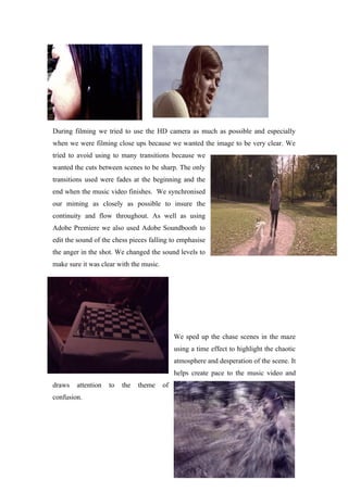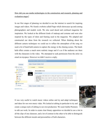 The document discusses how various media technologies were used at different stages of planning, researching, and producing a music video. In the planning stages, inspiration was drawn from websites and magazines showcasing photography, makeup, and filming techniques. A handheld camera was used to capture energy in chase scenes. Adobe Premiere was used to edit the video, including unique editing styles and tints/contrast to distinguish characters. During filming, an HD camera captured close-ups and cuts were kept sharp with few transitions. Adobe Soundbooth edited sound effects to emphasize emotions. Time effects sped up chase scenes to highlight chaos.