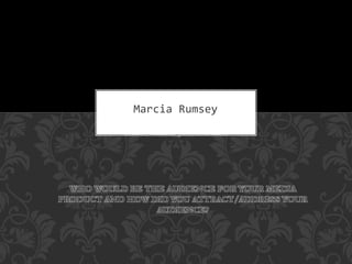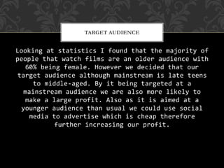 The document discusses strategies for attracting the target audience for a media product. It aims its psychological thriller film at a mainstream audience of late teens to middle-aged viewers to maximize profits. It will use social media advertising since it targets a younger demographic. The main protagonist is a teenage female to appeal to younger and female viewers who make up the majority of the genre's audience. An older male character was added to also attract more mature viewers. Props, costumes, and genre conventions are used strategically to engage different demographics.