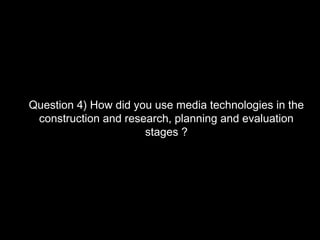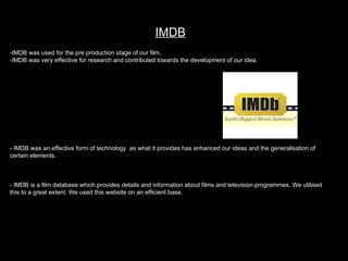The document discusses the use of various media technologies in the production of a student documentary film. IMDB, Short Film of the Week, YouTube, Wikipedia, Google Maps, Blogger, and filming equipment like a tripod, camera, microphone and boom pole were used in the construction, research, planning and evaluation stages of the film. These technologies provided information, inspiration from other films, ways to plan locations and share progress, and tools needed to capture footage. Hotmail and iMessage also helped the filmmakers contact and gain permission from parents to film the underage subjects of the documentary.