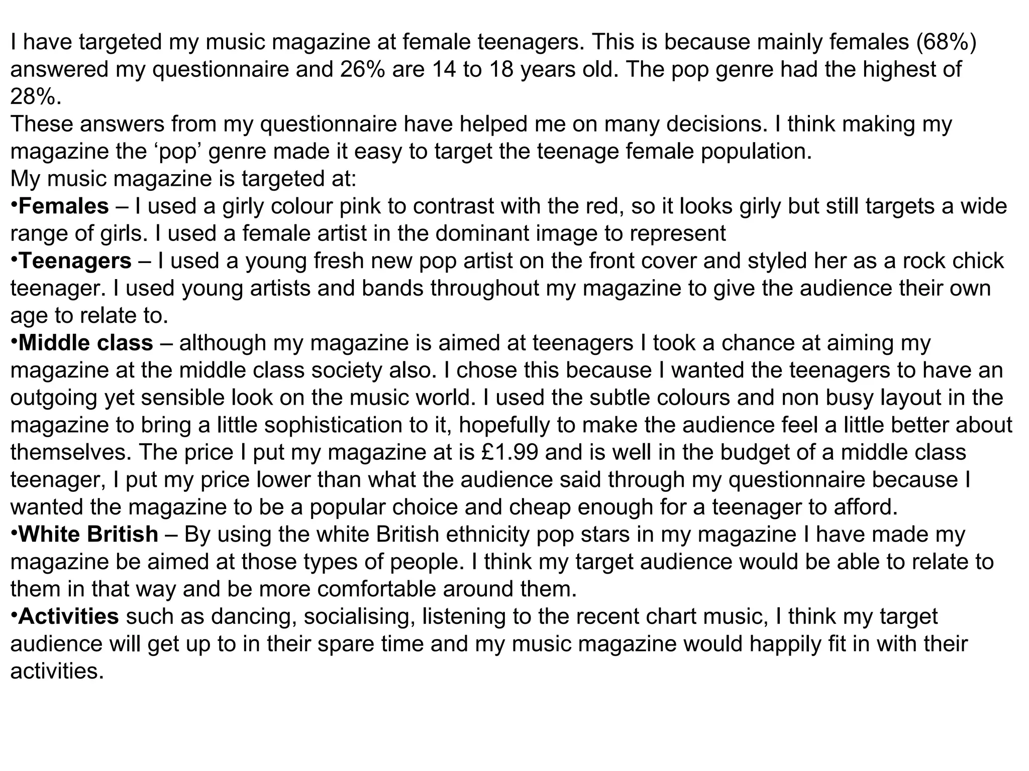 The document summarizes the target audience for a music magazine. It aims the magazine at female teenagers, ages 14 to 18, who enjoy pop music based on the results of a questionnaire. Specifically, the magazine targets middle class, white British females through its girly design, use of young pop artists on the cover, and affordable price of £1.99.