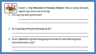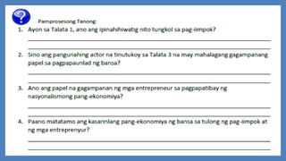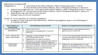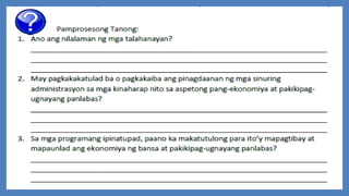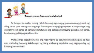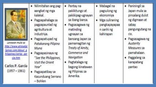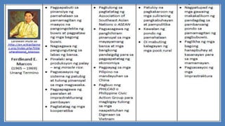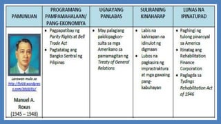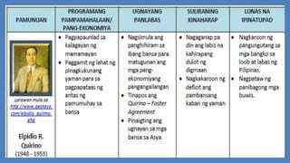 Ang mga unang dekada ng pagsasarili ng Pilipinas ay kinaharap ang iba't ibang hamon at tagumpay sa mga aspetong pampulitika, pang-ekonomiya, at panlipunan. Isinagawa ng iba't ibang administrasyon ang mga hakbang upang tugunan ang mga krisis, kabilang ang mga suliraning pang-ekonomiya at katiwalian, habang pinapanday ang landas tungo sa mas maunlad na bansa. Sa kabila ng mga hamon, nagpatuloy ang mga Pilipino sa pagbuo ng kanilang pagkakaisa at responsibilidad bilang mamamayan.